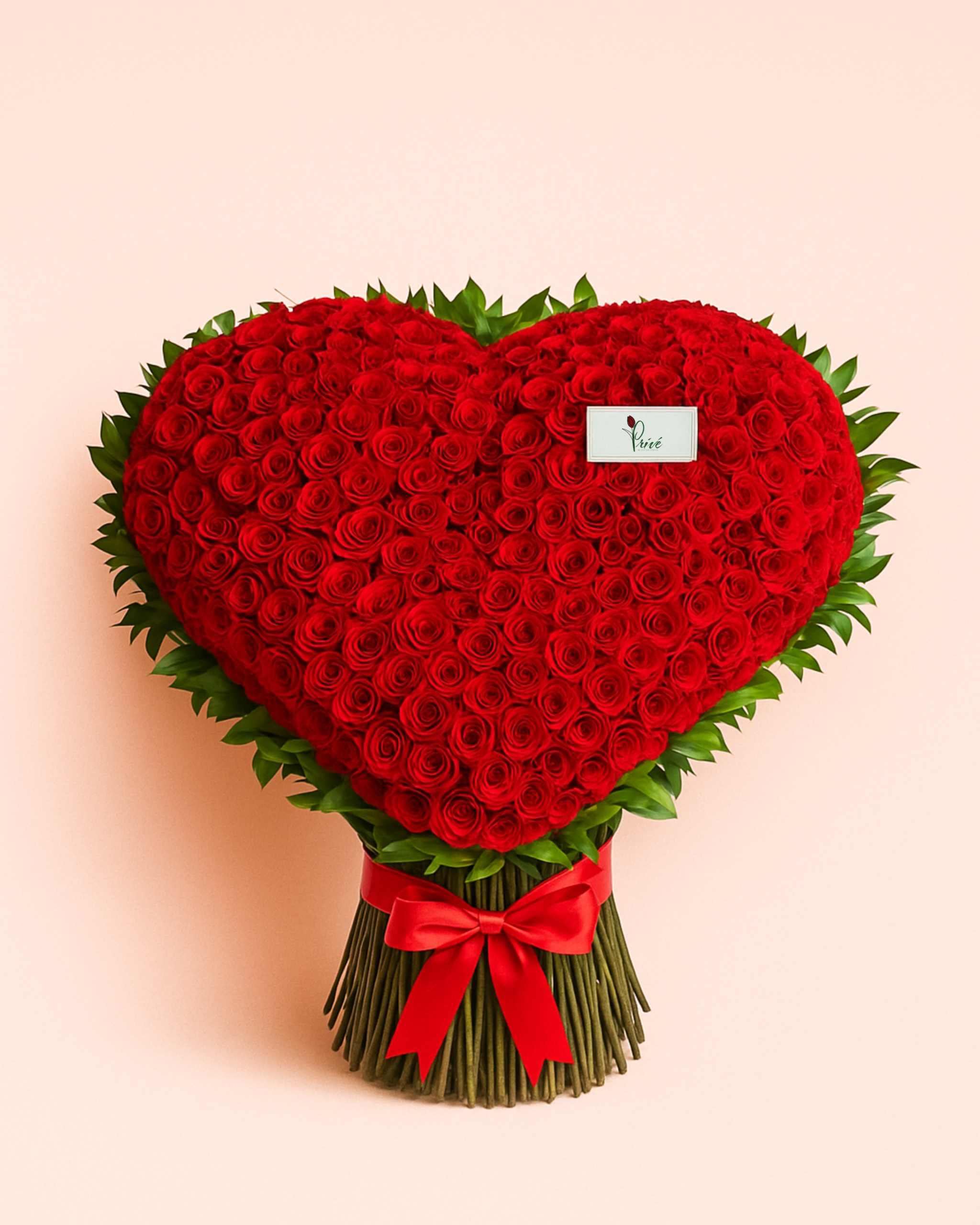 A breathtaking hand-tied arrangement of 200 premium red roses, meticulously crafted into a perfect heart shape and framed with fresh greenery. A luxurious and timeless declaration of love.