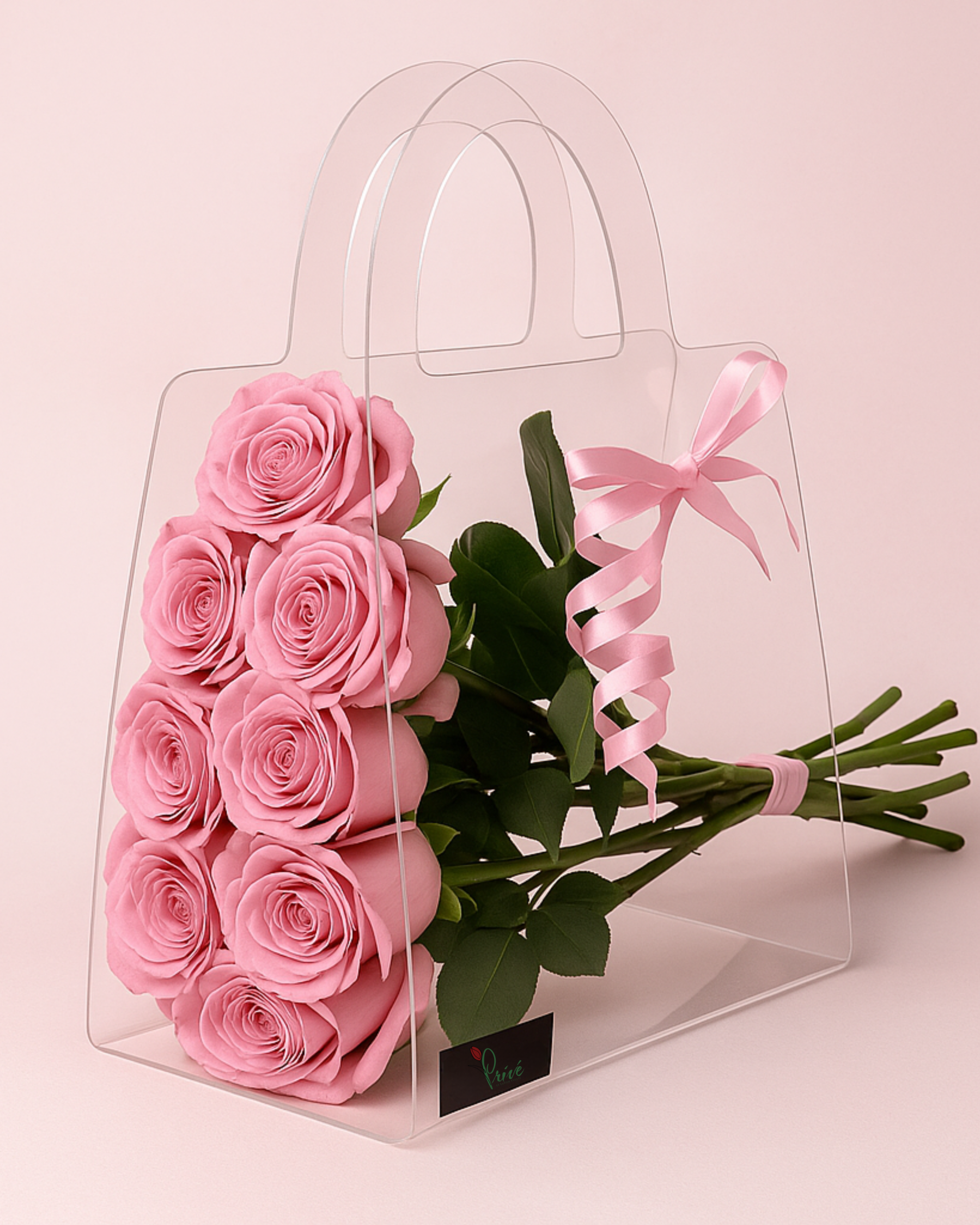 A chic transparent handbag-style box featuring 9 blush pink roses, elegantly tied with a satin ribbon. Minimal, stylish, and effortlessly romantic . ideal for modern gifting or elegant table décor.