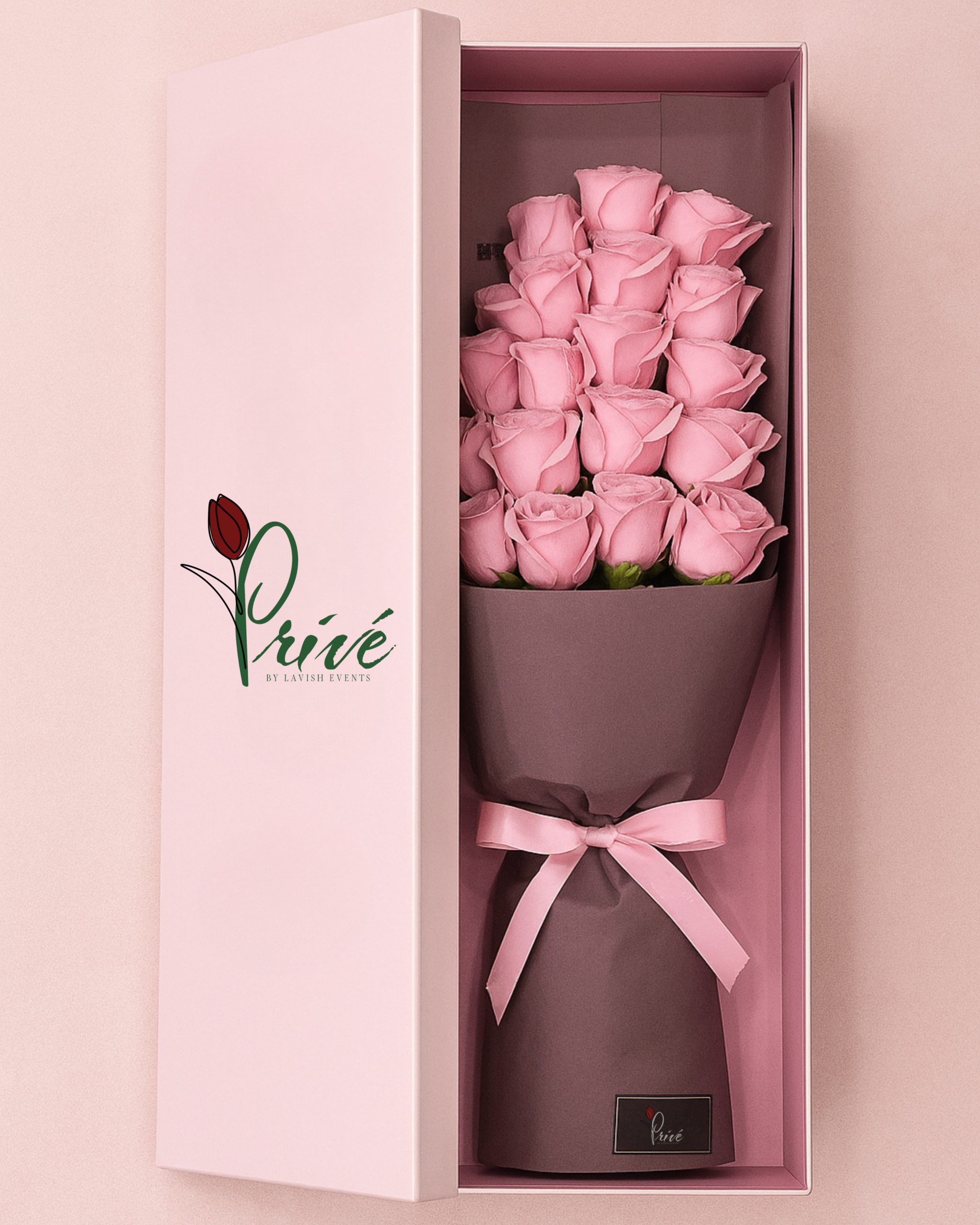 A chic 20 pink rose bouquet presented in an elegant soft-pink slide box. Wrapped in a deep mauve sleeve and tied with a satin ribbon, this design captures understated femininity and timeless grace ideal for birthdays, thank-you gifts, or romantic gestures.