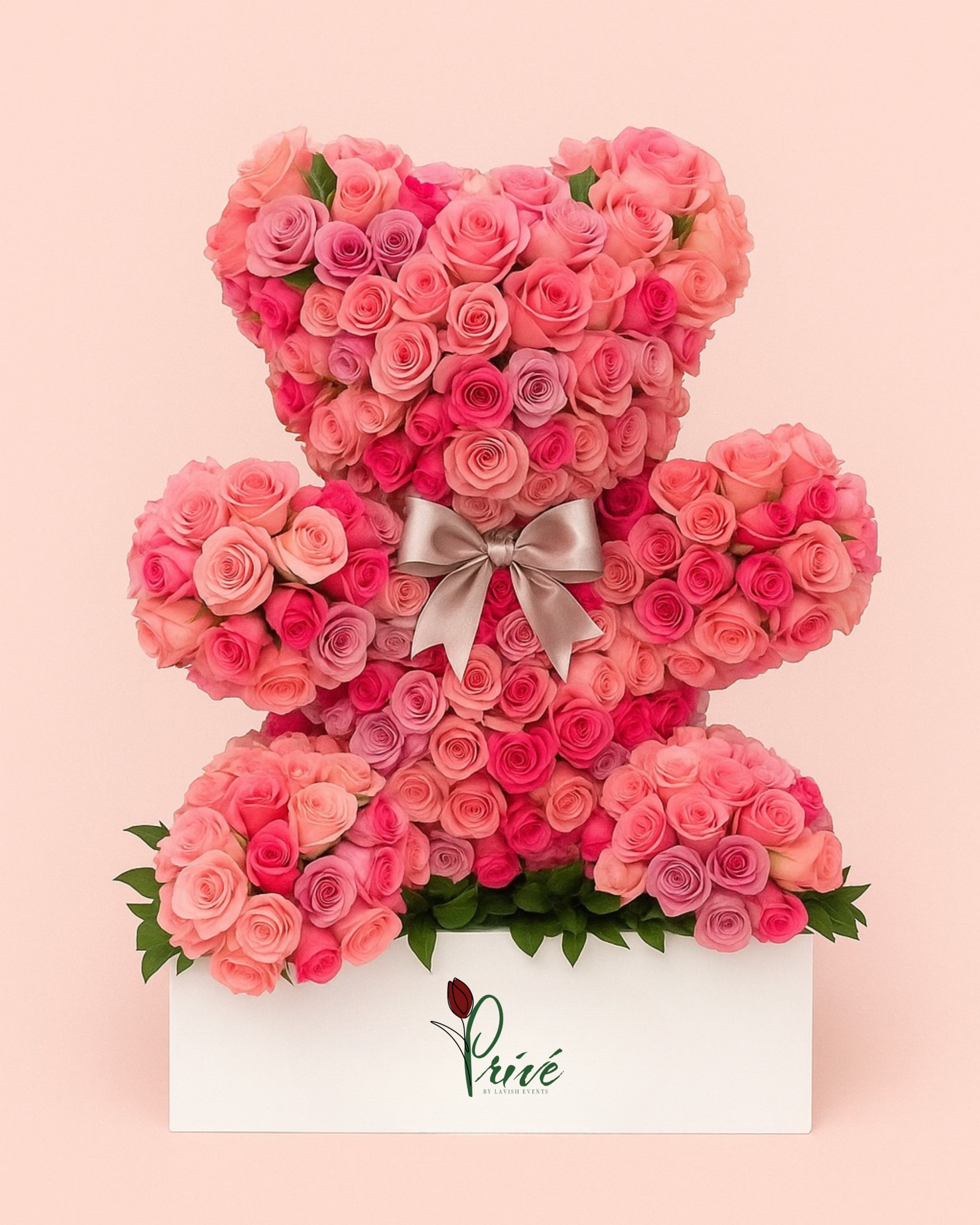 An adorable teddy bear handcrafted from over 400 roses in soft pink and fuchsia hues, finished with a satin champagne bow. A signature statement piece symbolizing love, sweetness, and artistry — ideal for grand gestures and luxury gifting.