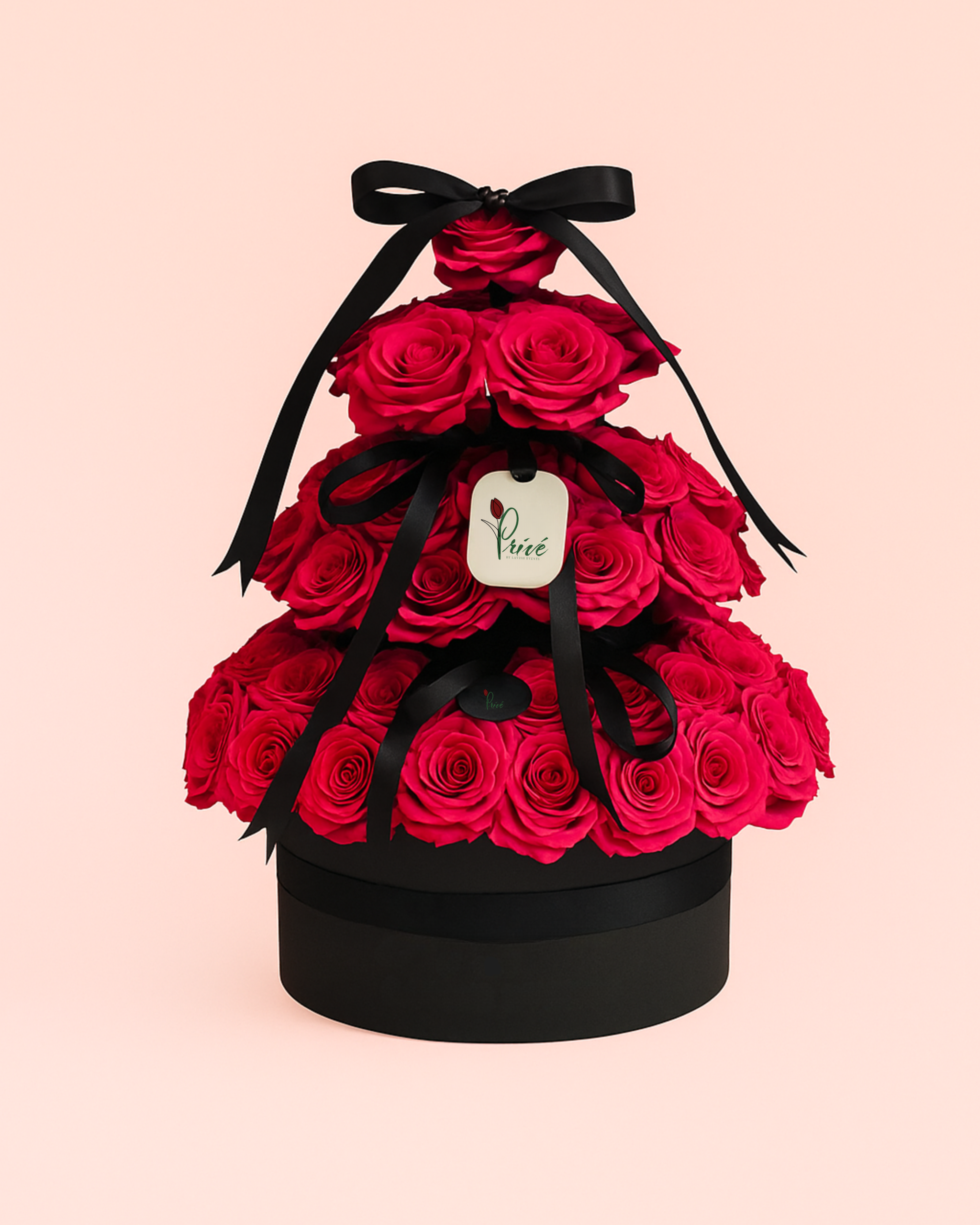A striking three-tier arrangement of 90 velvety red roses beautifully structured into a sculptural tower, adorned with a refined black satin ribbon and Privé tag. Designed for bold romantics and unforgettable statements.