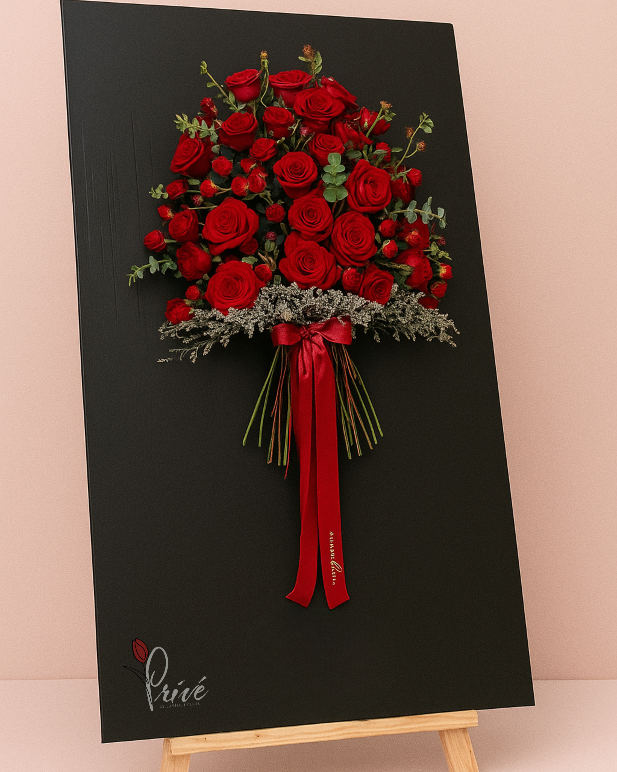 A dramatic floral composition of deep red roses and berries, artfully arranged on a sleek canva and tied with a satin red ribbon. A signature design blending modern minimalism with timeless romance.